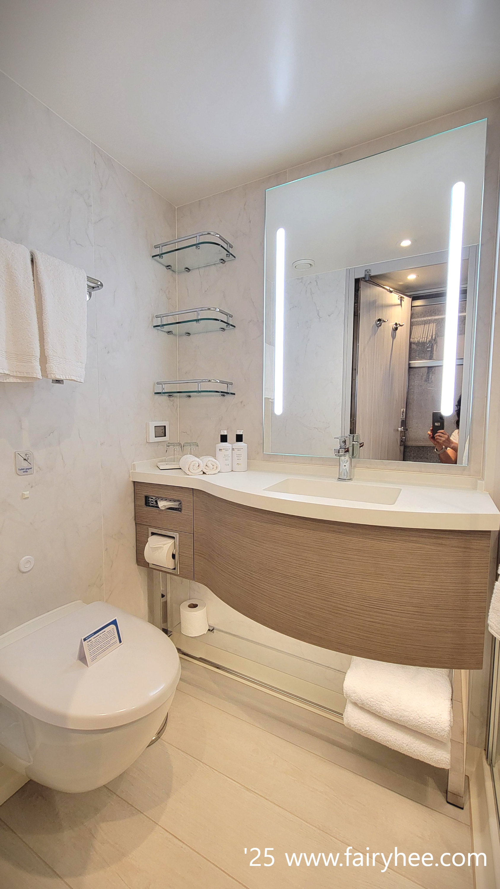 휠체어가 들어갈 수 있는 미니 스위트와 비교하면 무척 작았지만 깨끗하고 만족스러운 욕실이었다.