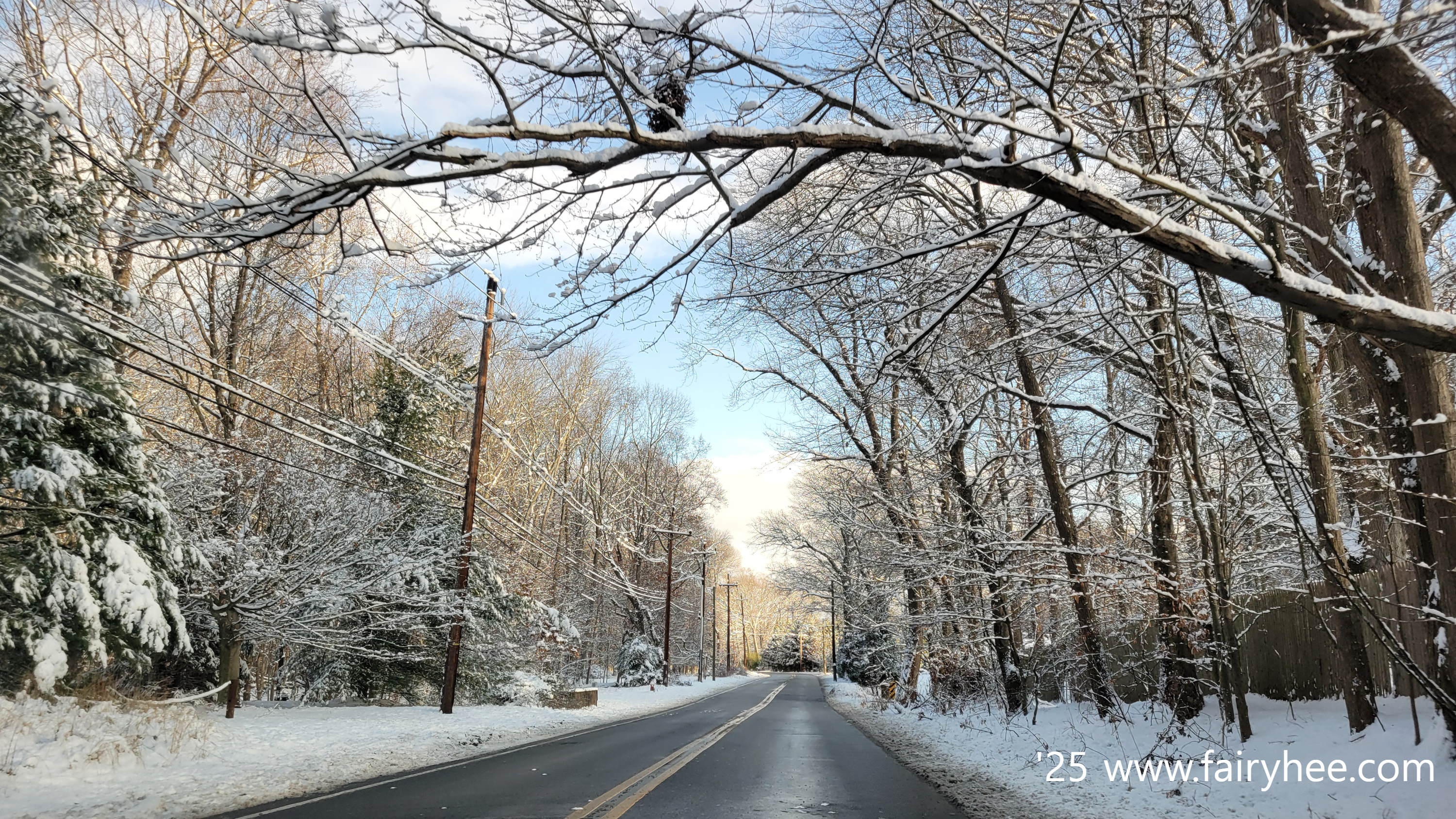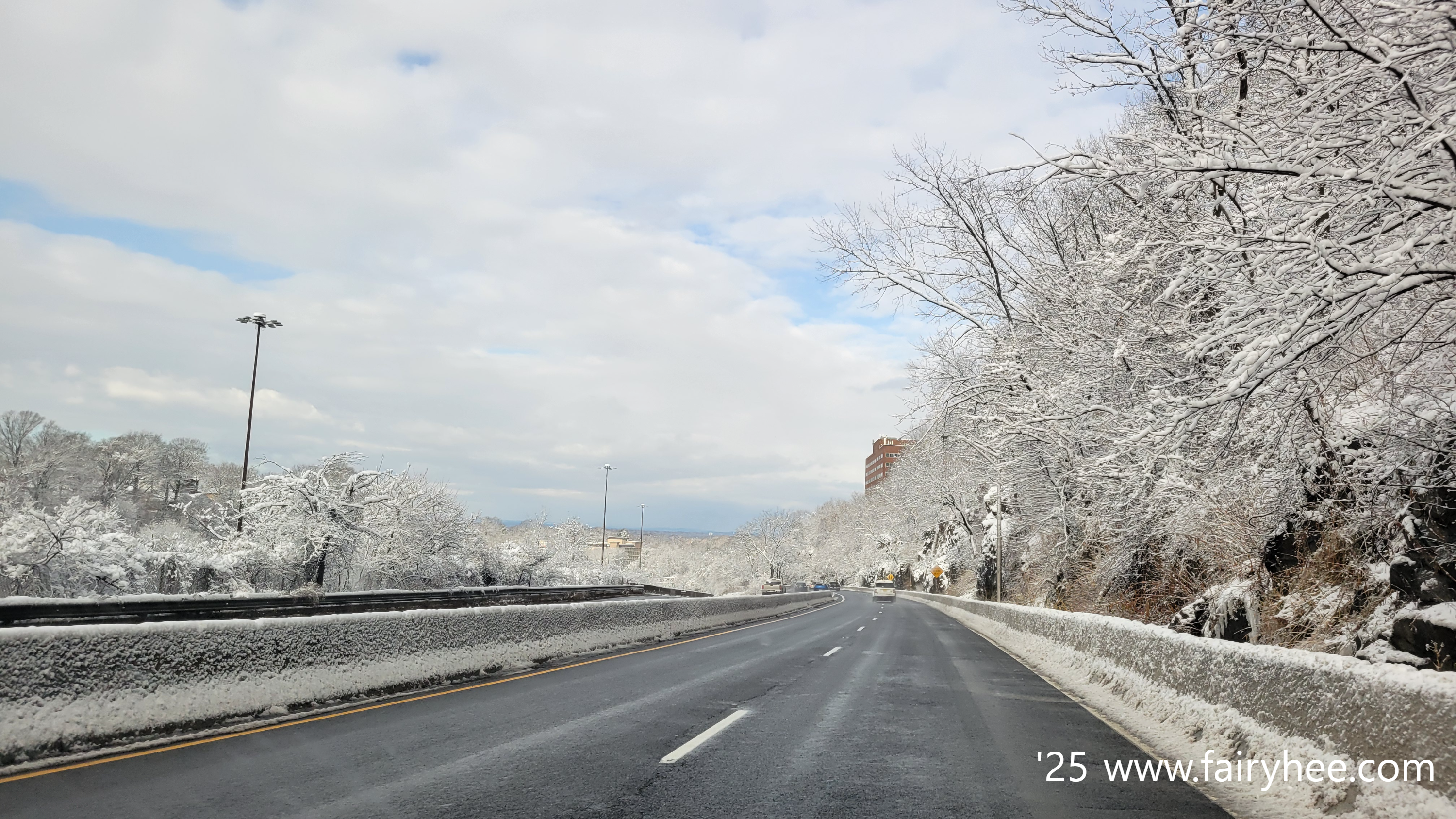 Rt 4는 깨끗하고 도로 주변의 나뭇가지에 쌓인 눈을 보며 눈이 내렸음을 실감한다.