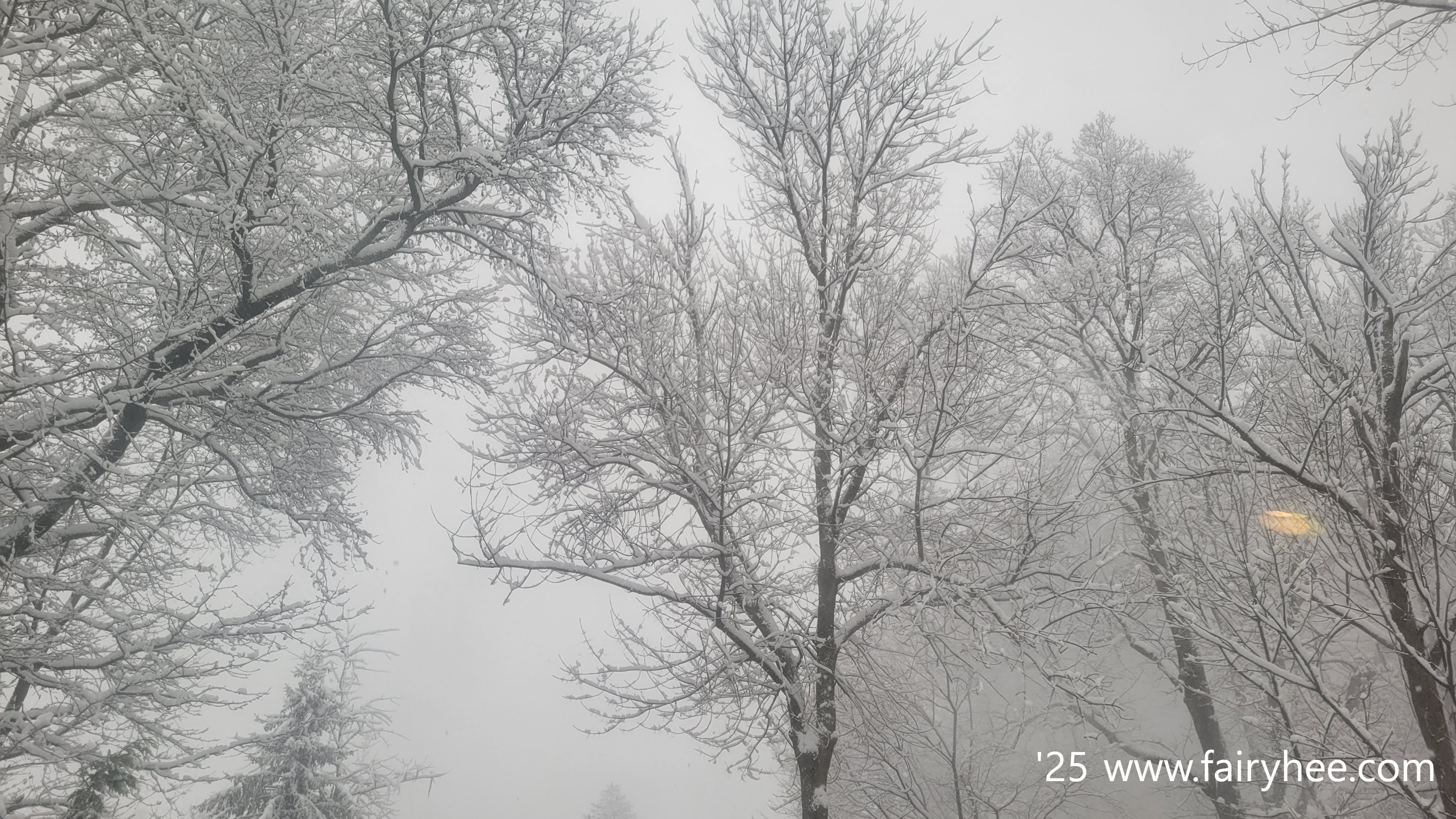 나무에 달라붙어 쌓이는 눈은 언제나 보기 좋다.