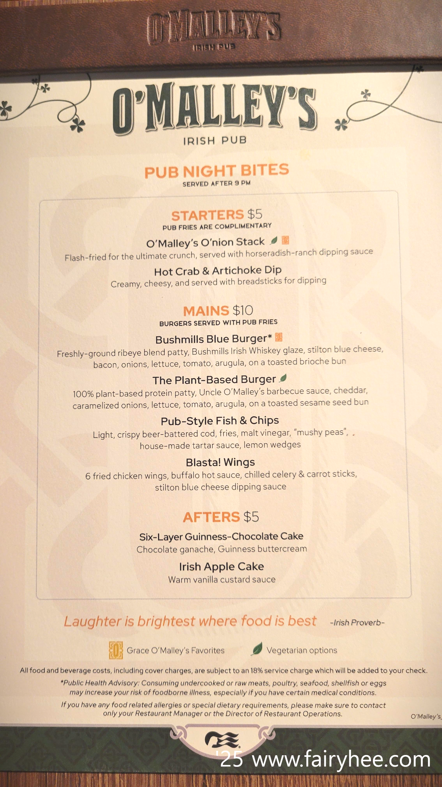 늦은 저녁에만 파는 스낵을 Sea Day 에는 아이리쉬 펍 런치로 먹을 수 있다.